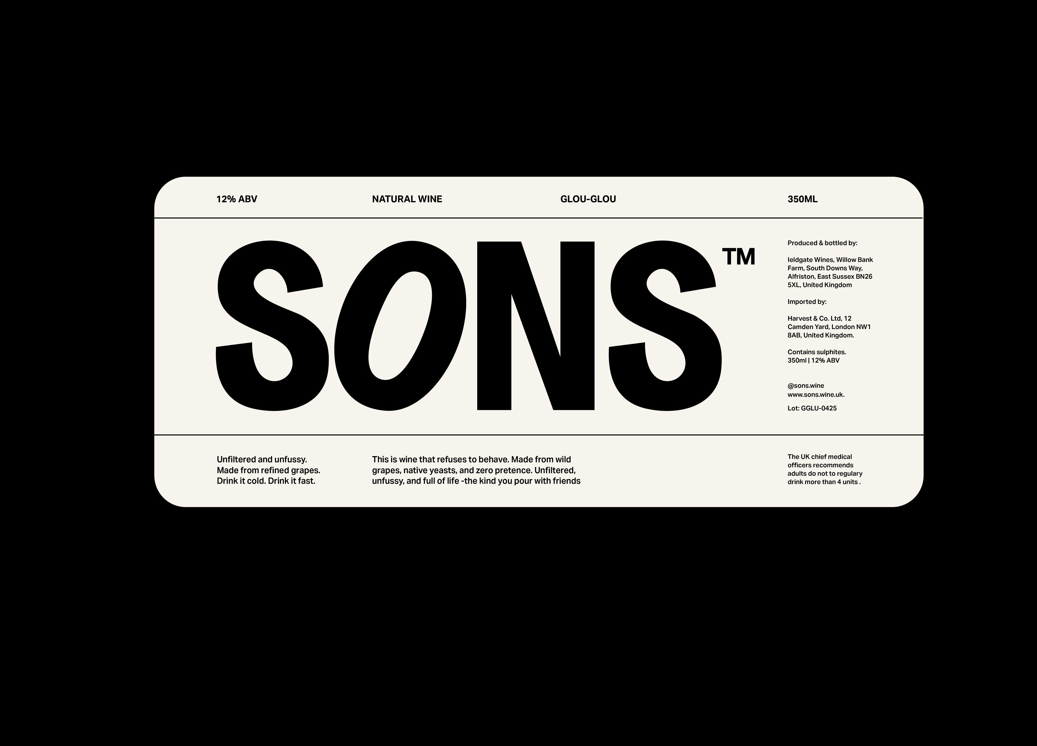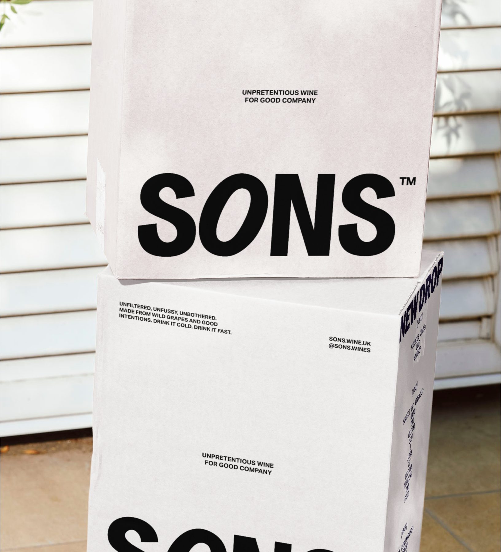SONS is a UK-based wine brand built around the idea of “unpretentious wine for good company.” The identity strips away the excess often found in wine branding, replacing it with bold simplicity and confident restraint. The logomark, set in a heavy sans serif, anchors the brand with clarity and presence — direct, modern, and unapologetically straightforward. The typography system follows suit: clean, utilitarian, and highly legible, allowing tone and layout to do the expressive work.